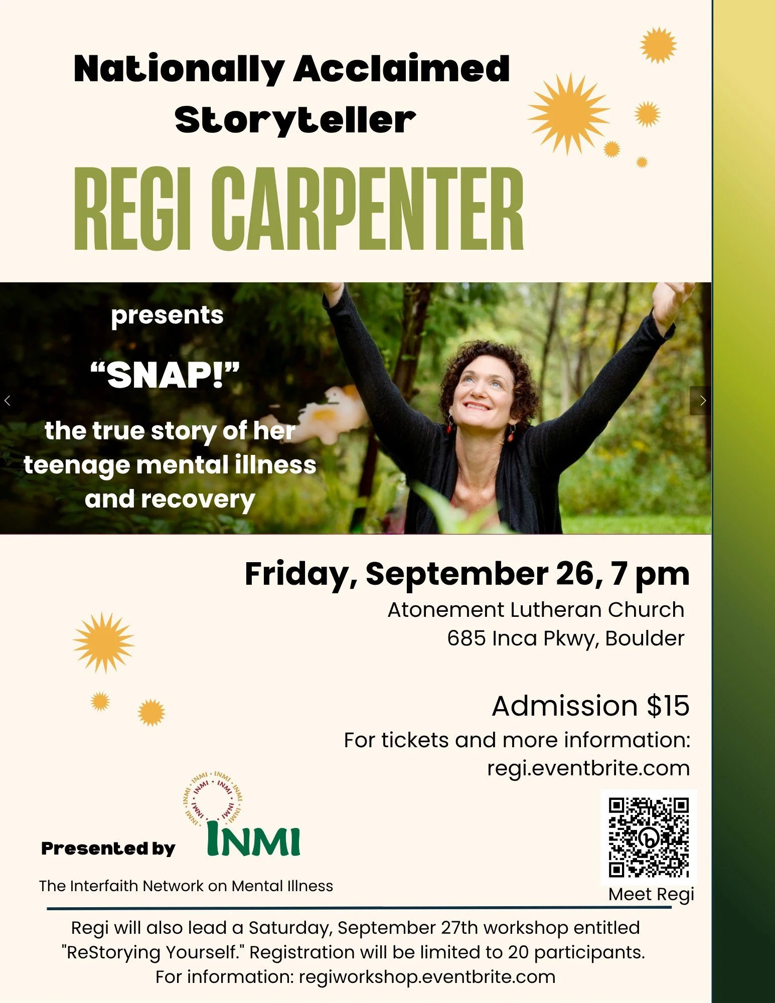 Regi Carpenter is an award-winning storyteller and performer. Whether performing at an intimate gathering, a large festival, or a convention of business professionals, Regi brings a remarkable blend of warmth, humor, and depth. Stories have taken Regi into schools, homes, hospitals, hospices, retreat centers, festivals, and faith-based communities across five continents. Regi has been a featured storyteller on The Moth Website and NPR. She is also a TEDx Talk presenter.